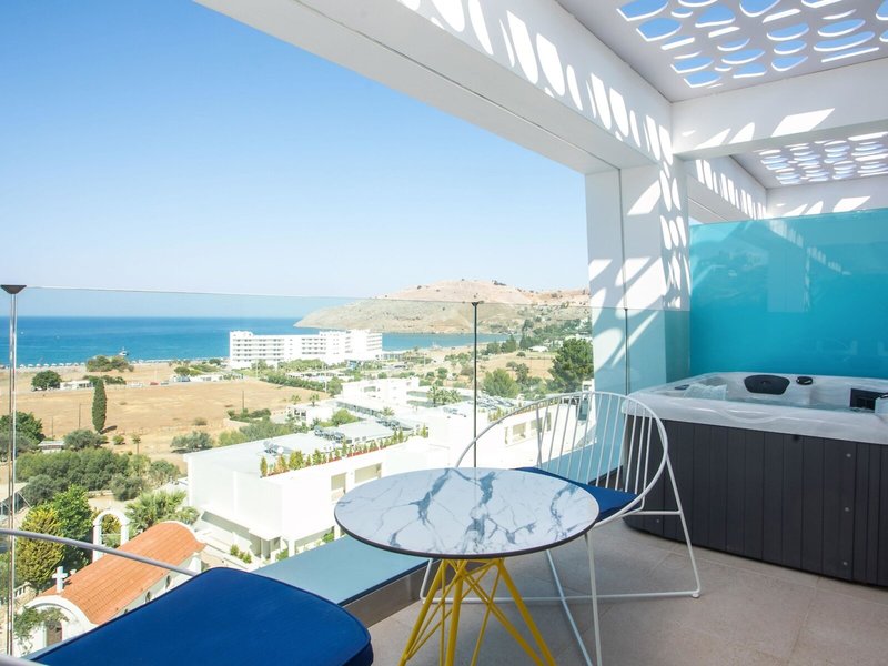 - Executive Junior Suite Sea View Upper Floor With Jacuzzi (JSM3), Juniorsuite, Nichtraucherzimmer, Mindestalter im Zimmer: 16 Jahre, Neubau, Meerseite, Meerblick, Buchtblick, Blick auf Vlycha Bay - Aegean Sea, ca. 30 m², letzte Komplettrenovierung 2022, letzte Teilrenovierung 2022, Gesamtanzahl der Räume in diesem Zimmertyp: 1, Aufteilung wie folgt: kombiniertes Wohn-/Schlafzimmer, 2 Einzelbetten (90x200cm), 1 Schlafsofa (80x190cm), Klimaanlage: ohne Gebühr, individuell regelbar, kalt, Fußboden: Fliesenboden, Safe: ohne Gebühr, Sofa, Schreibtisch, Espressomaschine, Kaffee-/Teezubereiter, Minibar: ohne Gebühr, Softdrinks: ohne Gebühr, Wasser: ohne Gebühr, Minibarauffüllung: mehrmals pro Woche, Telefon, Internet: WLAN/WiFi: ohne Gebühr, Fernseher: Flatscreen, im Schlafzimmer, deutsches Programm, Sat-TV, Reinigungsservice, Dusche, Regendusche, WC, Bademantel: ohne Gebühr, Slipper: ohne Gebühr, Föhn, Kosmetikspiegel, Balkon: mit Whirlpool, mit Liegen, mit Sitzgelegenheit