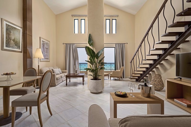 - 61-70 qm, Suite, 2 Etagen, Meerblick, 1 separates Schlafzimmer, kombinierter Wohn-/Schlafraum, 2 Bäder, Badewanne, 2 WCs, Bademantel, Badeslipper, Haartrockner, Kosmetikspiegel, Marmorboden, Klimaanlage, individuell regulierbar, Minibar kostenpflichtig, Safe, 2 TVs (Sat-TV), WLAN, Espressomaschine, Kaffee/Tee, Balkon oder Terrasse
