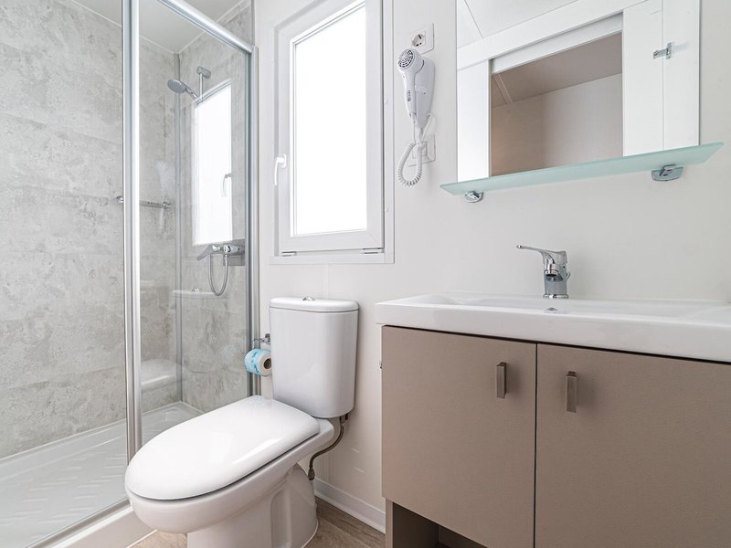 - Mobilný dom Baia Revolution (MHX6), Mobilný dom, Strana parku, Výhľad do záhrady, cca 32 m², Celkový počet izieb v tomto type izby: 4, Rozloženie: 3 spálne, 4 samostatné postele, 1 manželská posteľ, Klimatizácia: platba v hotovosti, cca 8 EUR na deň, individuálne ovládaná, chladenie, teplo, Podlaha: PVC, Kuchynský kút, Chladnička, TV: v obývacej časti, Sprcha, WC, Terasa: s posedením
