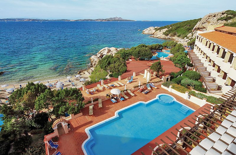 Der Garten duftet nach Erika und Rosmarin, bizarre Felsen, die der Wind seit Jahrhunderten schleift, setzen Akzente: Das Hotel fügt sich wunderbar in die Landschaft ein. Die Poollandschaft erstreckt sich über mehrere Ebenen vom Hotel bis hinunter zum Strand.