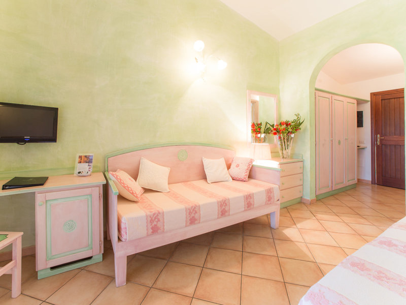 - Comfort (DZX2), Doppelzimmer, Gartenseite, Parkseite, Gartenblick, Parkblick, Blick auf den Garten oder die Insel Tavolara, ca. 20 - 26 m², Gesamtanzahl der Räume in diesem Zimmertyp: 1, Aufteilung wie folgt: kombiniertes Wohn-/Schlafzimmer, Babybett: pro Tag ca. 20 EUR, Klimaanlage: individuell regelbar, kalt, warm, Heizung, Safe, Standventilator, Getränkespender, Sofa, Schreibtisch, Minibar: gegen Gebühr, Softdrinks: gegen Gebühr, Wasser: gegen Gebühr, alkoholische Getränke: gegen Gebühr, Snacks: gegen Gebühr, Minibarauffüllung, Telefon, Internet: WLAN/WiFi: ohne Gebühr, Fernseher: Flatscreen, im Schlafzimmer, deutsches Programm, Sat-TV, Roomservice: gegen Gebühr, Reinigungsservice, Tageszeitung, Dusche, WC, Föhn, Balkon oder Terrasse: mit Sitzgelegenheit