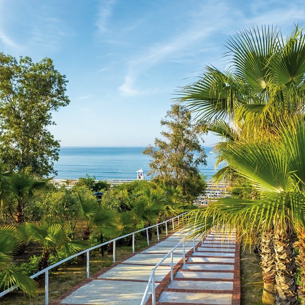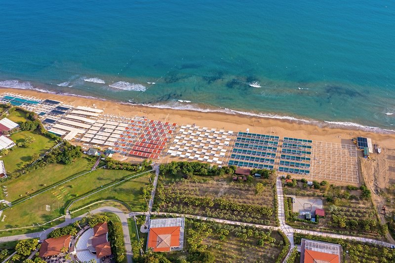- Sandstrand: leicht abfallend, von der Anlage getrennt durch Promenade, Sonnenschirme, Liegen, Strandtuch/Badetuch