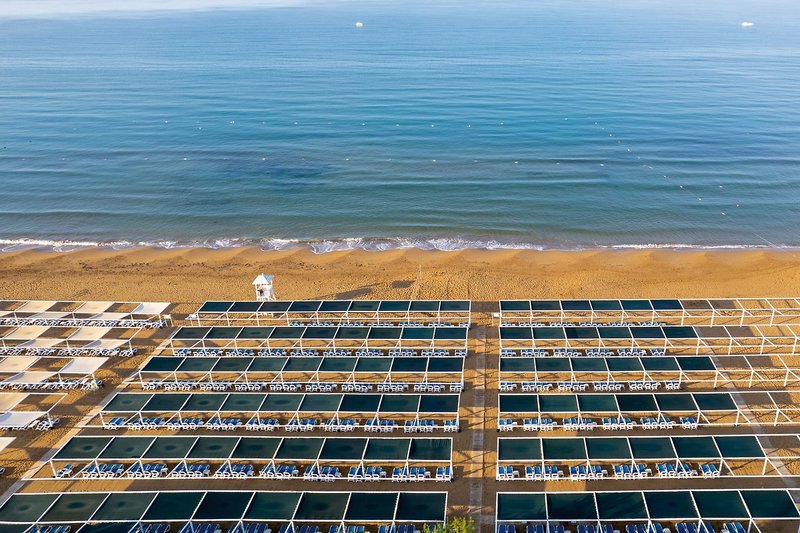 - Piesočnatá pláž: mierne svahovitá, oddelená od komplexu promenádou, slnečníky, ležadlá, plážové osušky/osušky