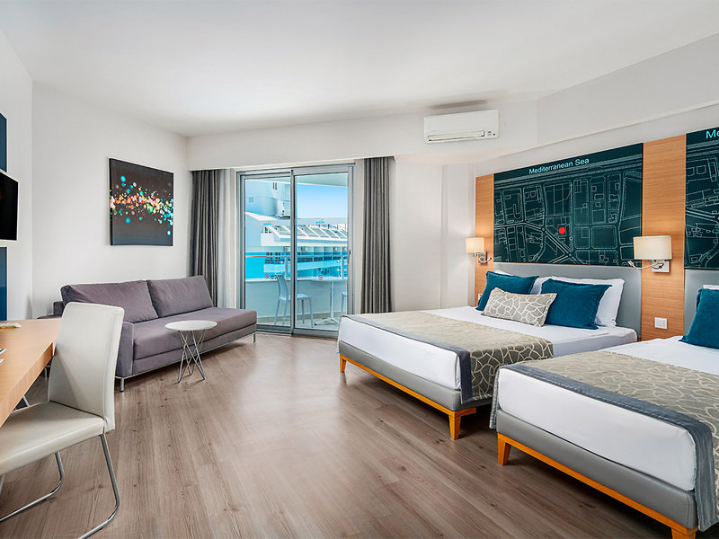 Familienzimmer (FZC, ca. 44 qm; April-Oktober), 1 sep. Schlafzimmer. Klimaanlage, Minibar, WLAN (gegen Gebühr), Mietsafe, Telefon, TV. Dusche, WC, Föhn. Balkon. Wahlweise Poolblick (FZP; April-Oktober). Max. 4E