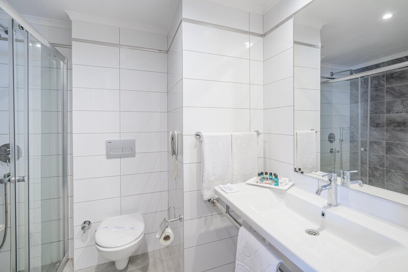 Ubytovanie: Dvojlôžková izba (DZA, cca 20 m²) v prístavbe. Klimatizácia, minibar, Wi-Fi (za poplatok), trezor na prenájom, telefón, TV. Sprcha, WC, fén. Balkón. Max. 2 dospelí + 1 dieťa (Ž26/27 2 dospelí)