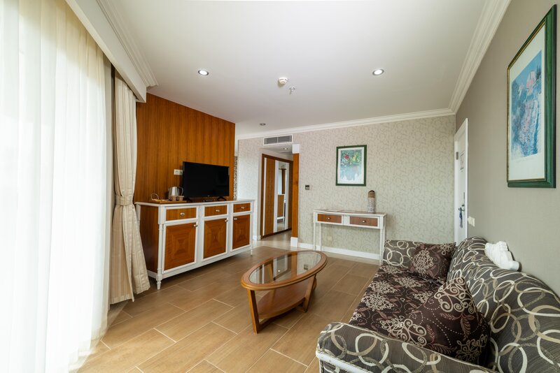 Rodinná izba (FZ, cca 40-44 m2), 2 oddelené spálne, spojovacie dvere, klimatizácia (centrálna, bežná), TV, telefón, trezor, minibar, rýchlovarná kanvica. Sprcha, WC, fén. Balkón, voliteľne s čiastočným výhľadom na more (FZM). Maximálne 4E