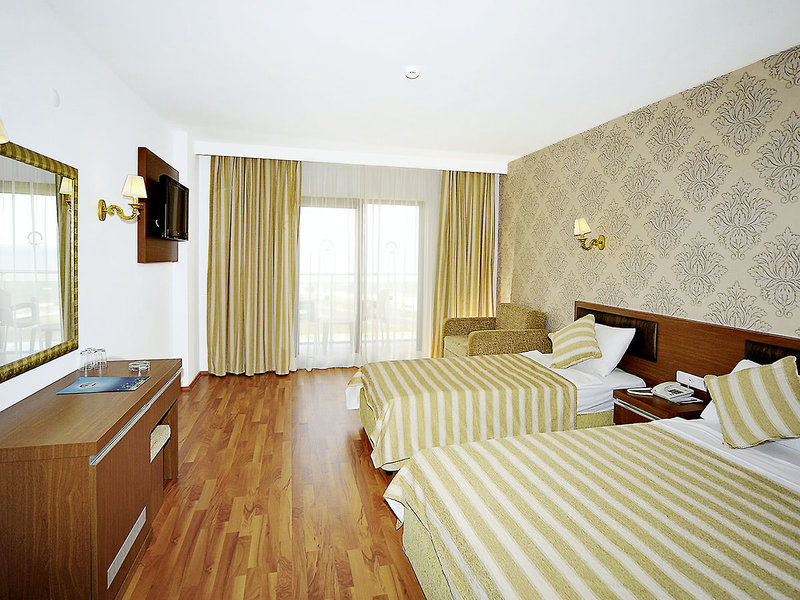 Ausstattung: Hotel der gehobenen Mittelklasse mit 2 Haupt- (HH) und 4 Wohngebäuden (WG). Pools, sep. großer Aquapark Eftalia Island (stdw. ca. 10:00-12:00 Uhr und 14:00-17:00 Uhr), Sonnenterr., Liegen, Auflagen, Schirme am Pool/Strand (Badetücher geg. Kaution). Pool-/Snackbar (wetterabh.). Rezeption, Lobbybar, WLAN (Rezeption, Zimmer), Restaurant, À-la-carte-Restaurant (Reservierung, wetterabhängig), Bars, Patisserie, Pub, TV-Raum, Geschäfte. Gamecenter, Spa. Landeskat.: 5 St., 470 Zi., 3-5 Etg., Lifte (HH).