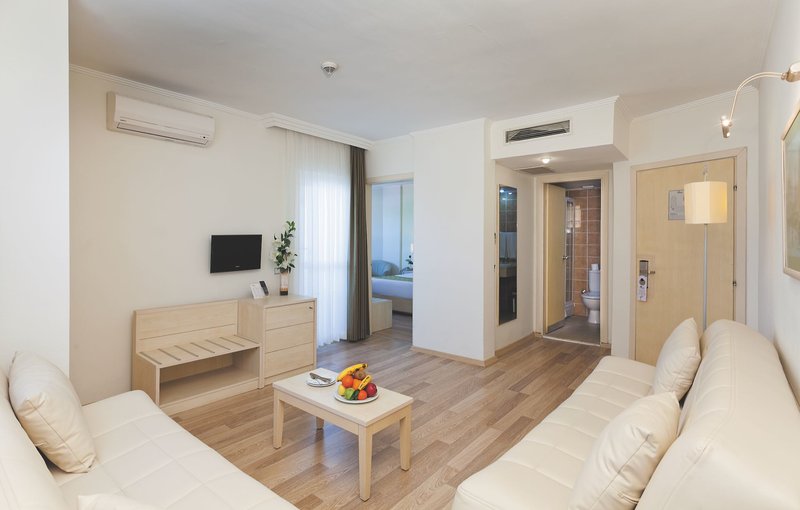 Familiensuite: Verfügen bei ansonsten ebenfalls gleicher Ausstattung über ein Schlafzimmer mit Doppelbett und einen Wohn-/Schlafraum mit zwei Klappsofas und Verbindungstür sowie Balkon und Poolblick (2FS).
