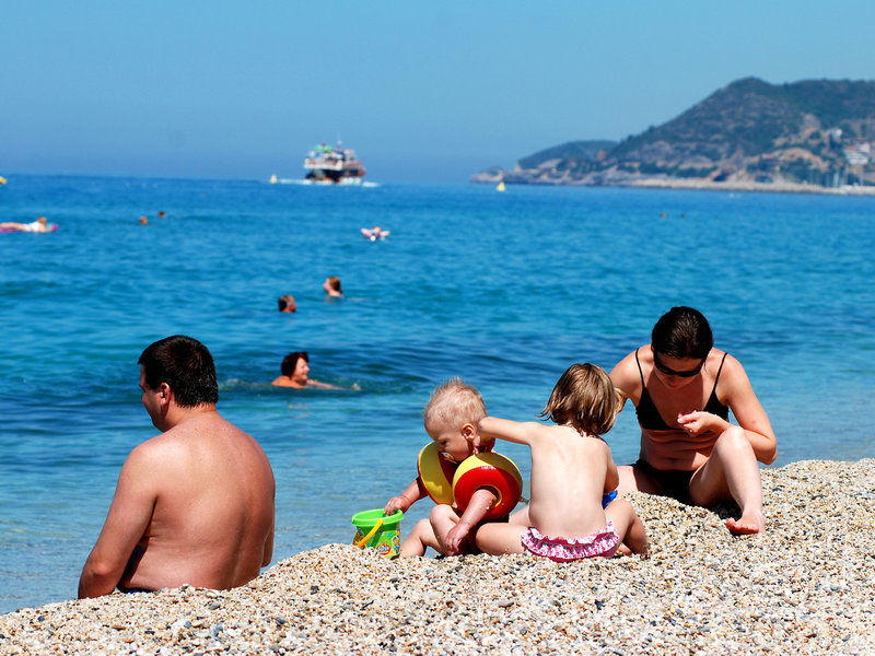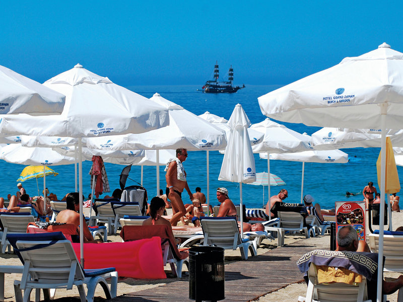 - Strand: Sand, flach abfallend, Liegestühle, Sonnenschirme
