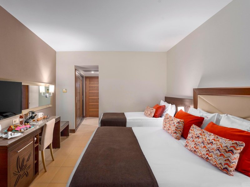 - Family Room Land View Comfort (DZX6), Familienzimmer, im Hauptgebäude, Landblick, ca. 40 m², letzte Teilrenovierung 2019, Gesamtanzahl der Räume in diesem Zimmertyp: 2, Aufteilung wie folgt: bestehend aus 2 Doppelzimmern mit Verbindungstür, 2 Einzelbetten (90x200cm), 1 Doppelbett (160x200cm), Babybett: ohne Gebühr, Anfrage & Reservierung nicht notwendig, Klimaanlage: ohne Gebühr, bei All Inclusive inklusive, saisonabhängig; wetterabhängig, individuell regelbar, zentral gesteuert, kalt, Fußboden: Fliesenboden, Laminat, Parkett, Safe: ohne Gebühr, Minibar: ohne Gebühr, Softdrinks, Wasser: ohne Gebühr, Minibarauffüllung: täglich, Telefon, Internet: WLAN/WiFi: ohne Gebühr, Fernseher: Flatscreen, deutsches Programm, Sat-TV, Radio, Roomservice: täglich 00:00 Uhr - 06:00 Uhr, gegen Gebühr, Dusche, WC, Föhn, Balkon: mit Sitzgelegenheit