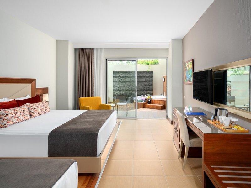 - Jacuzzi Terrace Room Land View (DZX3), Doppelzimmer, im Hauptgebäude, Landblick, ca. 30 m², letzte Teilrenovierung 2019, Gesamtanzahl der Räume in diesem Zimmertyp: 1, Aufteilung wie folgt: 1 Schlafzimmer, 1 Einzelbett (90x200cm), 1 Doppelbett (160x200cm), Babybett: ohne Gebühr, Anfrage & Reservierung nicht notwendig, Klimaanlage: ohne Gebühr, bei All Inclusive inklusive, saisonabhängig; wetterabhängig, individuell regelbar, zentral gesteuert, kalt, Fußboden: Fliesenboden, Laminat, Parkett, Safe: ohne Gebühr, Sitzecke, Minibar: ohne Gebühr, Softdrinks, Wasser: ohne Gebühr, Minibarauffüllung: täglich, Telefon, Internet: WLAN/WiFi: ohne Gebühr, Fernseher: Flatscreen, deutsches Programm, Sat-TV, Radio, Roomservice: täglich 00:00 Uhr - 06:00 Uhr, gegen Gebühr, Dusche, WC, Föhn, Balkon: mit Whirlpool, mit Sitzgelegenheit, Balkon oder Terrasse: mit Whirlpool, mit Sitzgelegenheit