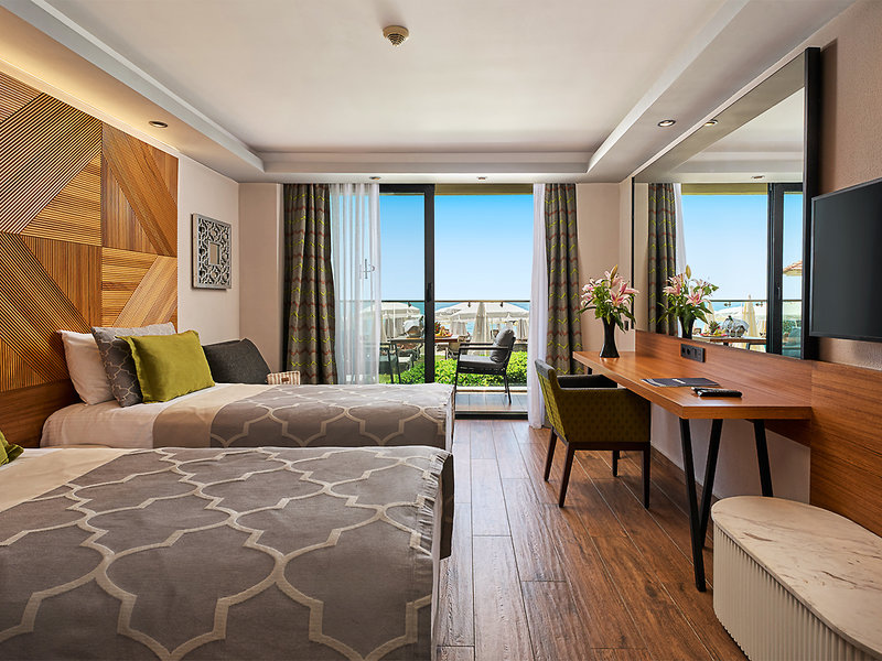 Doppelzimmer (DMS, ca. 24 qm), Hauptgebäude, Klimaanl., Mietsafe, Minibar, WLAN, TV, Telefon, Wasserkocher. Dusche, WC, Föhn. Balkon zur Meerseite. Max. 2E+1K