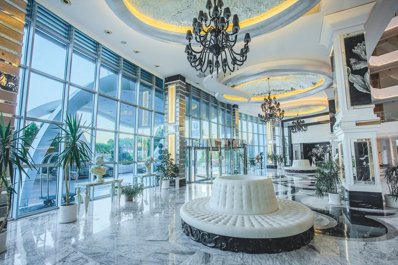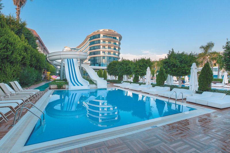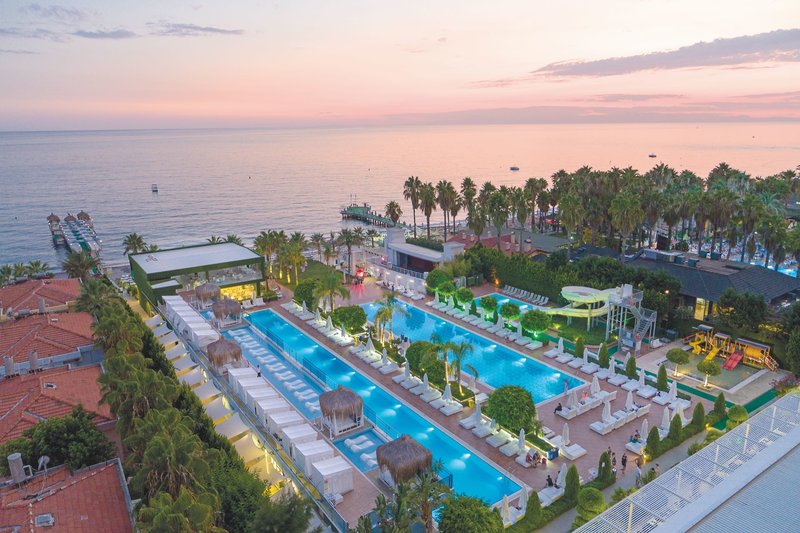 Ausstattung: Die moderne und weitläufige Hotelanlage verfügt über insgesamt 350 Zimmer, die sich auf ein sechsstöckiges Haupthaus verteilen. Zu den Einrichtungen gehören eine Empfangshalle mit Rezeption und gemütlichen Sitzgelegenheiten, Lifts, sowie ein Buffetrestaurant mit Terrasse, zwei À-la-carte-Restaurants (bei einem Mindestaufenthalt von sieben Nächten einmal nach Voranmeldung und Verfügbarkeit inklusive, sechs Tage die Woche offen), verschiedene Bars, Sat.-TV-Ecke. Geschäfte und Wellness-Center (jeweils gegen Gebühr). Hallenbad mit Kinderbecken (in der Wintersaison offen). Im Hotelgebäude ist Wi-Fi inklusive. In der gepflegten Gartenanlage befinden sich ein Süßwasser-Swimmingpool, ein kleiner Pool mit zwei Wasserrutschen (stundenweise in Betrieb), mit Sonnenterrasse, separatem Kinderpool sowie Pool-/Snackbar. Am Strand steht eine Beachbar zur Verfügung. Liegen, Auflagen, Sonnenschirme und Badehandtücher (Wechsel gegen Gebühr) sind sowohl am Pool als auch am Strand mit tollem Badesteg inklusive.