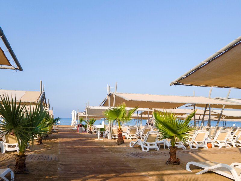Ausstattung: Garten, 4 Pools, Kinderpool, Wasserrutsche. Liegen, Schirme, Handtücher am Pool und am Strand (geg. Geb.), Beach-Bar, Pool-/Snackbar. Empfangshalle, Rezeption, Lobby-Bar, Lounge. Restaurant (Buffet) mit italienischen Speisen, Terrasse, Bar, Shop, Friseur, Diskothek. 450 Zimmer, 6 Etagen, 9 Lifte.