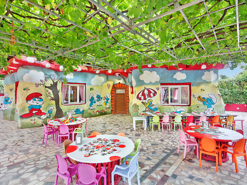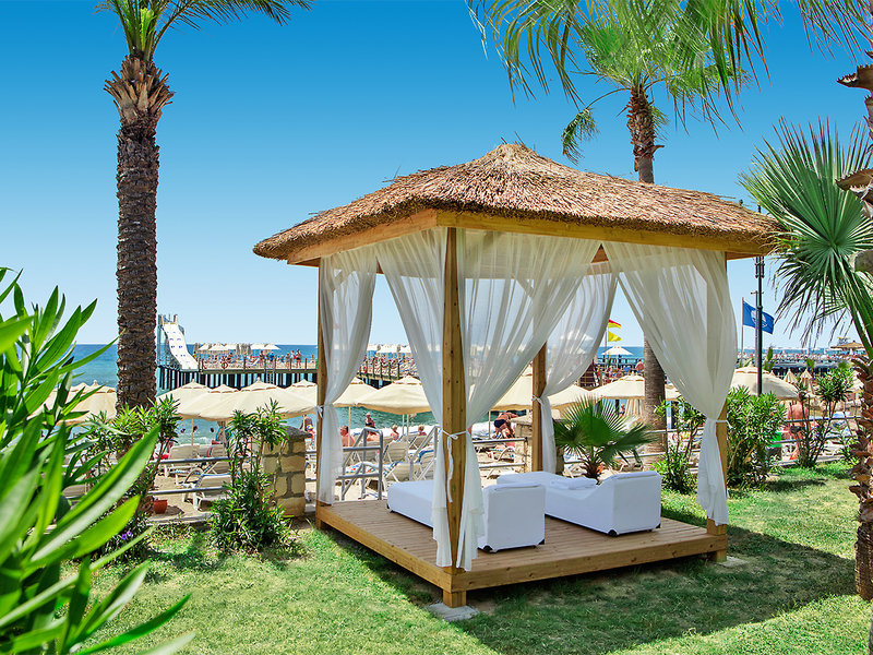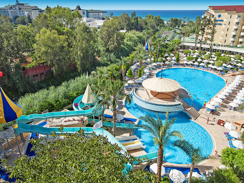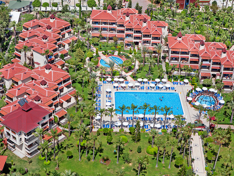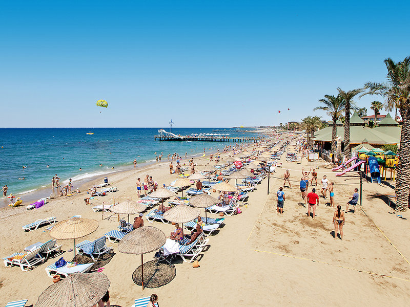 Ausstattung: Ferienanlage der gehobenen Mittelklasse, 2 Swimmingpools, 3 Wasserrutschen, Badesteg mit Wasserrutschen direkt ins Meer (wetterabh.), Sonnenterrasse, Liegen, Schirme, Auflagen und Badetücher am Pool und am Strand, Pool-/Snackbar. Empfangshalle, Rezeption, Lobbybar, WLAN (in öffentlichen Bereichen), Hauptrestaurant, 4 À-la-carte-Restaurants (u. a. Fisch, italienisch, geöffnet 15.05.-30.09.), Bars, Outdoordiskothek (wetterabh.), Amphitheater, Geschäfte, Friseur. Landeskategorie: 5 Sterne, 668 Zimmer.