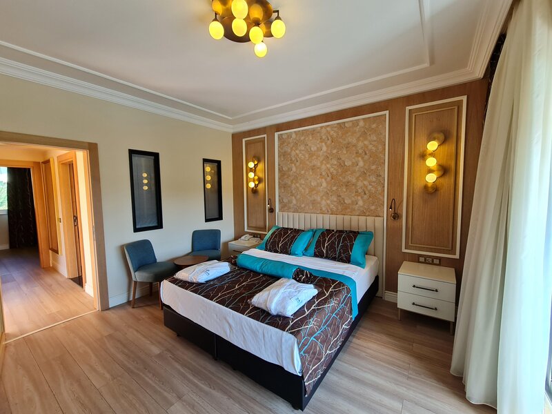 Vila (VI, cca 25 m²), individuálne nastaviteľná klimatizácia, rýchlovarná kanvica, príslušenstvo na prípravu kávy/čaju, minibar, telefón, trezor na prenájom, 26-palcový TV. Sprcha, WC, fén. Balkón. Max. 3 dospelí
