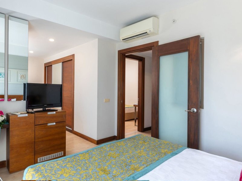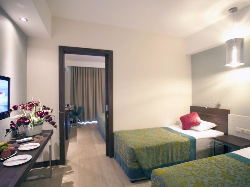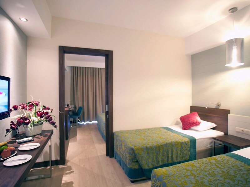 - Comford Family Suite Room (FZX4), Familienzimmer, im Hauptgebäude, Landseite, ca. 40 - 42 m², letzte Teilrenovierung 2023, Gesamtanzahl der Räume in diesem Zimmertyp: 2, Aufteilung wie folgt: bestehend aus 2 Zimmern, optisch getrennt durch Schiebetür, 2 Einzelbetten, 1 Doppelbett, Babybett: ohne Gebühr, Klimaanlage: ohne Gebühr, individuell regelbar, kalt, warm, Fußboden: Laminat, Safe: gegen Gebühr, Minibar: ohne Gebühr, Telefon, Internet: WLAN/WiFi: ohne Gebühr, Fernseher: Flatscreen, Sat-TV, Dusche, WC, Föhn, Balkon: mit Sitzgelegenheit