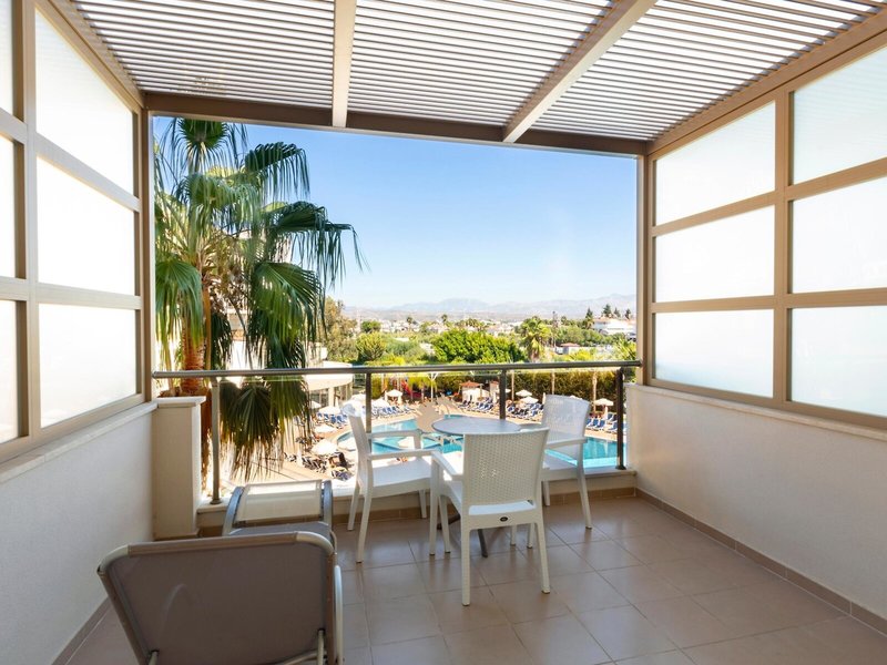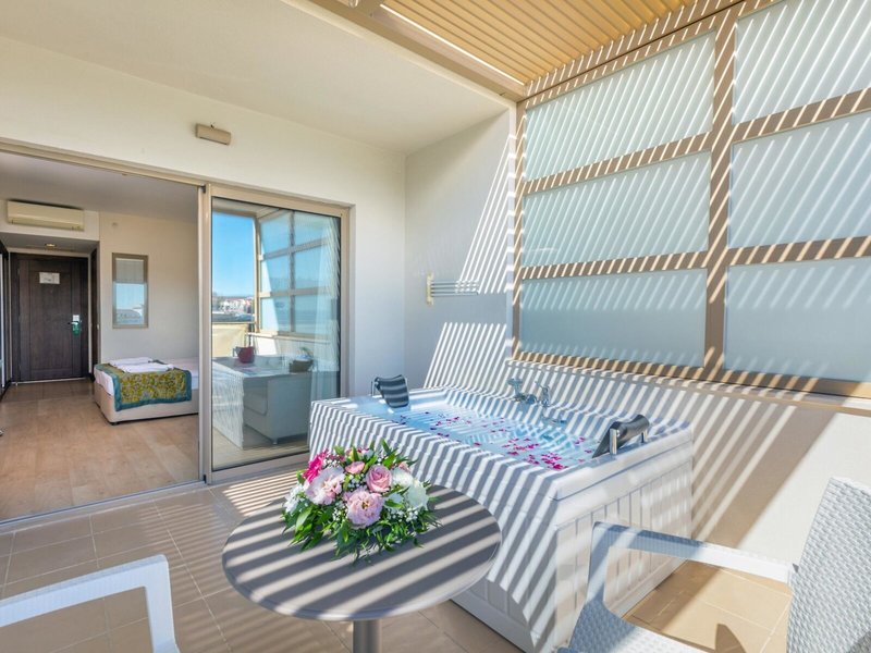- Junior Family Suite Room (JSX1), Familienzimmer, im Hauptgebäude, Poolseite, Poolblick, ca. 32 - 36 m², letzte Teilrenovierung 2023, Gesamtanzahl der Räume in diesem Zimmertyp: 3, Aufteilung wie folgt: bestehend aus 2 Zimmern, optisch getrennt durch Schiebetür, Wohnzimmer, 2 Einzelbetten, 1 Doppelbett, Babybett: ohne Gebühr, Klimaanlage: ohne Gebühr, individuell regelbar, kalt, warm, Fußboden: Laminat, Safe: gegen Gebühr, Minibar: ohne Gebühr, Telefon, Internet: WLAN/WiFi: ohne Gebühr, Fernseher: Flatscreen, Sat-TV, Dusche, WC, Föhn, Balkon: mit Sitzgelegenheit