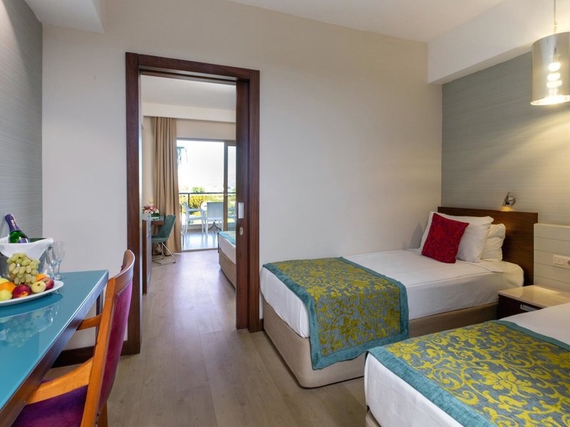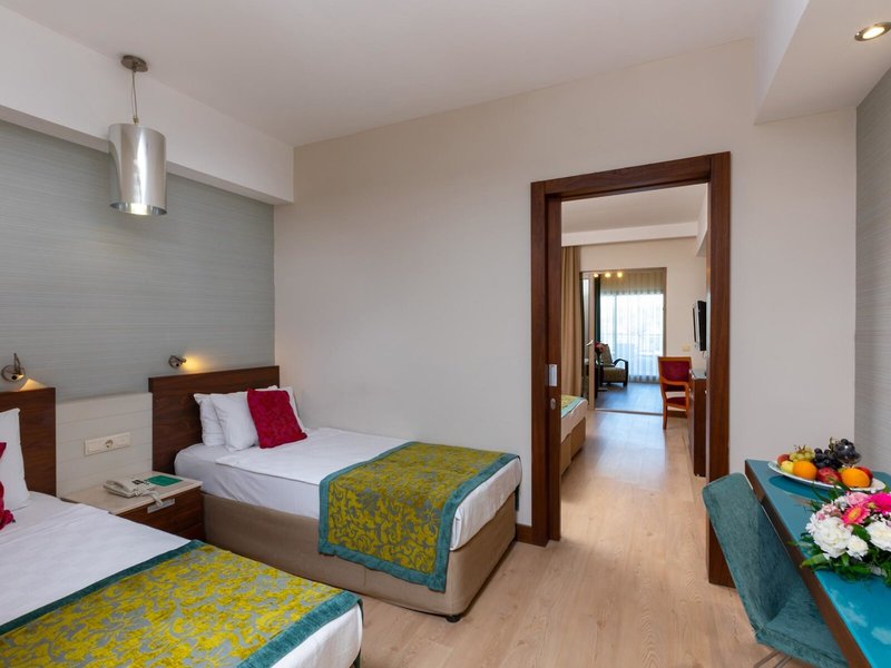 - Family Suite Room (FZX2), Familienzimmer, im Hauptgebäude, Landseite, ca. 32 - 36 m², letzte Teilrenovierung 2023, Gesamtanzahl der Räume in diesem Zimmertyp: 2, Aufteilung wie folgt: bestehend aus 2 Zimmern, optisch getrennt durch Schiebetür, 2 Einzelbetten, 1 Doppelbett, Babybett: ohne Gebühr, Klimaanlage: ohne Gebühr, individuell regelbar, kalt, warm, Fußboden: Laminat, Safe: gegen Gebühr, Minibar: ohne Gebühr, Telefon, Internet: WLAN/WiFi: ohne Gebühr, Fernseher: Flatscreen, Sat-TV, Dusche, WC, Föhn, Balkon: mit Sitzgelegenheit