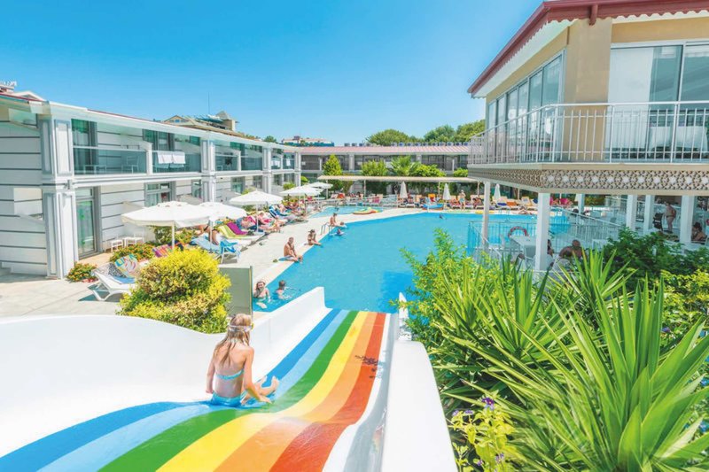 Vybavenie: Tento rezortný komplex s celkovým počtom 146 izieb rozmiestnených v hlavnej budove a piatich prístavbách ponúka vstupnú halu s barom, Wi-Fi, klimatizovanú bufetovú reštauráciu a bar pri bazéne. Vonkajšia časť ponúka sladkovodný bazén so samostatným detským bazénom a bazén s tobogánom (otvorený v stanovených časoch). Lehátka, vankúše a slnečníky sú k dispozícii pre všetkých hostí bezplatne, a to ako tu, tak aj na pláži. Plážové osušky sú k dispozícii za poplatok pri výmene.