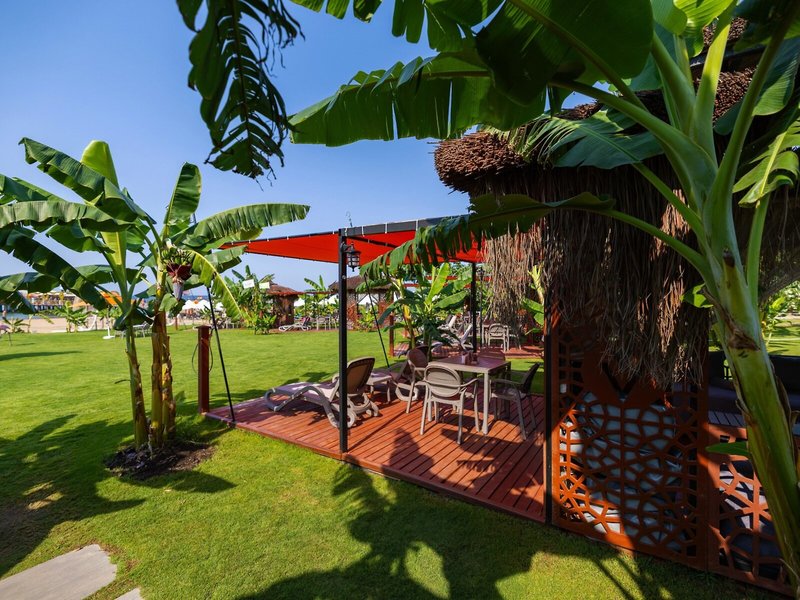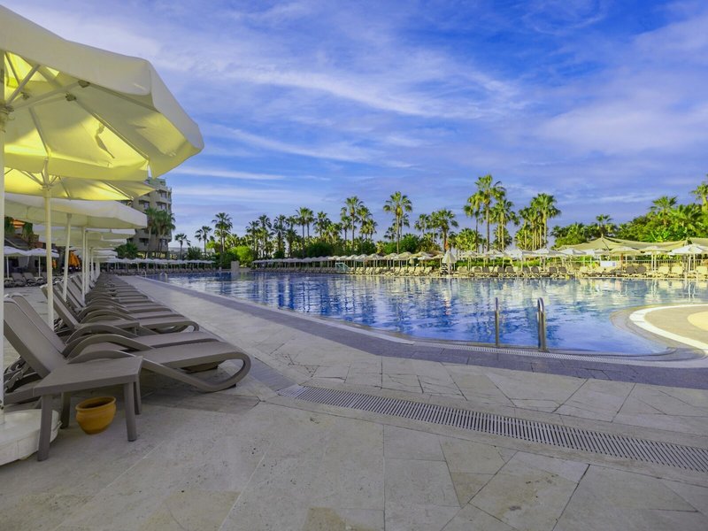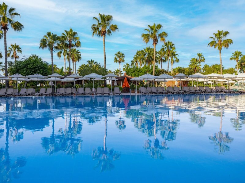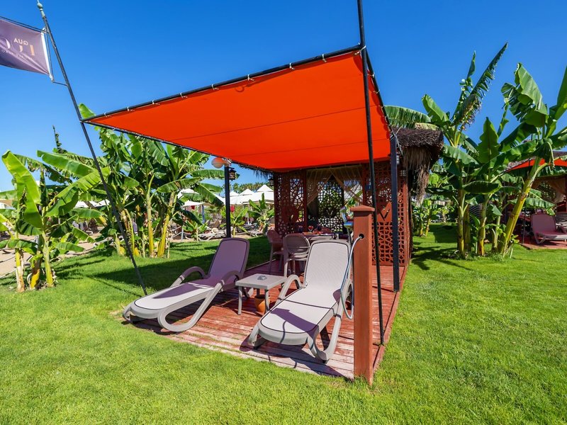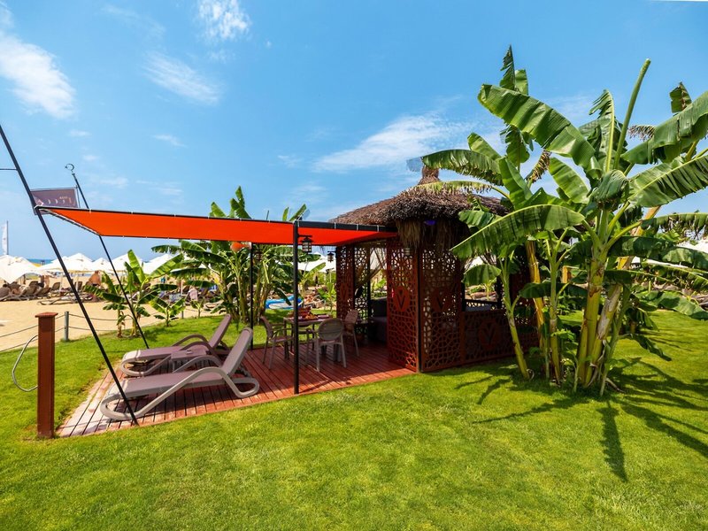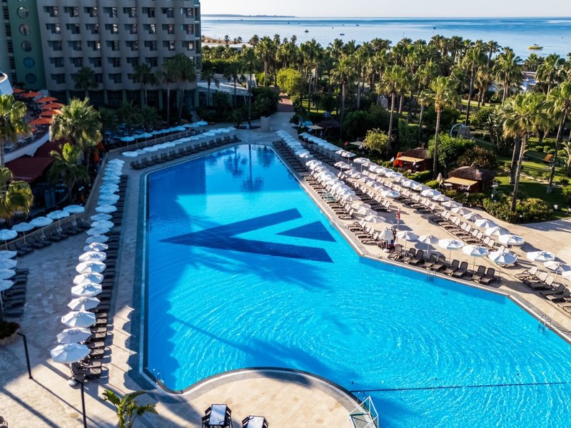 Ausstattung: Garten, Pool, Kinderpool, Wasserrutsche. Liegen, Schirme, Auflagen, Handtücher am Pool und am Strand (geg. Geb.), Pool-/Snackbar. Empfangshalle, Rezeption, Lobby-Bar, Lounge. Restaurant (Buffet) mit nationalen, italienischen und mediterranen Speisen, Terrasse, Bar, Minimarkt, Shop, Friseur, Diskothek. 404 Zimmer, 6 Etagen, 8 Lifte.