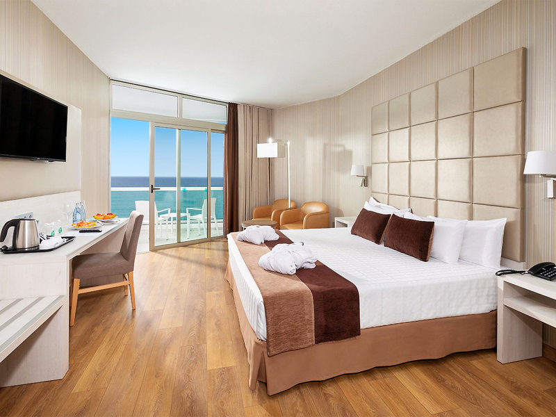 Doppelzimmer-Superior (DSP, ca. 28 qm; Senator), gut eingerichtet, obere Etagen, Klimaanlage (Juni-September), Sitzecke, Minibar (Füllung auf Anfrage, geg. Gebühr), Wasserkocher, TV (32 Zoll), Telefon, WLAN, Safe. Obst/Wasser bei Ankunft. Bad/Dusche, WC, Bademantel, Föhn. Balkon mit herrlichem Meerblick. Max. 3E