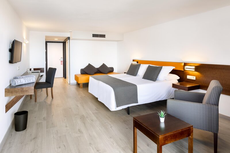 Familienzimmer (FA, ca. 32 qm), Klimaanlage, WLAN, TV, Mietsafe, Minibar (geg. Geb.). Dusche/WC, Föhn. Terrasse. Max. 3E+1K