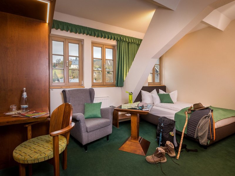 Poloha a okolie: Hotel sa nachádza uprostred chaty Saigerhütte Olbernhau Grünthal, ktorá je zapísaná na zozname svetového dedičstva UNESCO, a ponúka ideálny východiskový bod na objavovanie Krušných hôr. Krušnohorská cyklotrasa je vzdialená približne 8 km. Nachádza sa priamo na cyklotrase Flöhtal a cyklotrase Saského stredohoria.