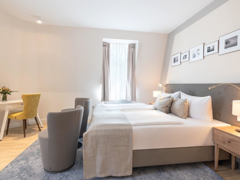- Komfortzimmer Villa Möve (DZX9), Suite, im Nebengebäude, Landseite, Stadtblick, ca. 38 - 42 m², Gesamtanzahl der Räume in diesem Zimmertyp: 1, Aufteilung wie folgt: 1 Schlafzimmer, 2 Doppelbetten (90x200cm), 1 Zustellbett, Babybett: ohne Gebühr, Anfrage notwendig, Heizung, Fußboden: Teppichboden, Safe: ohne Gebühr, Telefon, Internet: WLAN/WiFi: ohne Gebühr, Fernseher: Sat-TV, Dusche, WC, Föhn