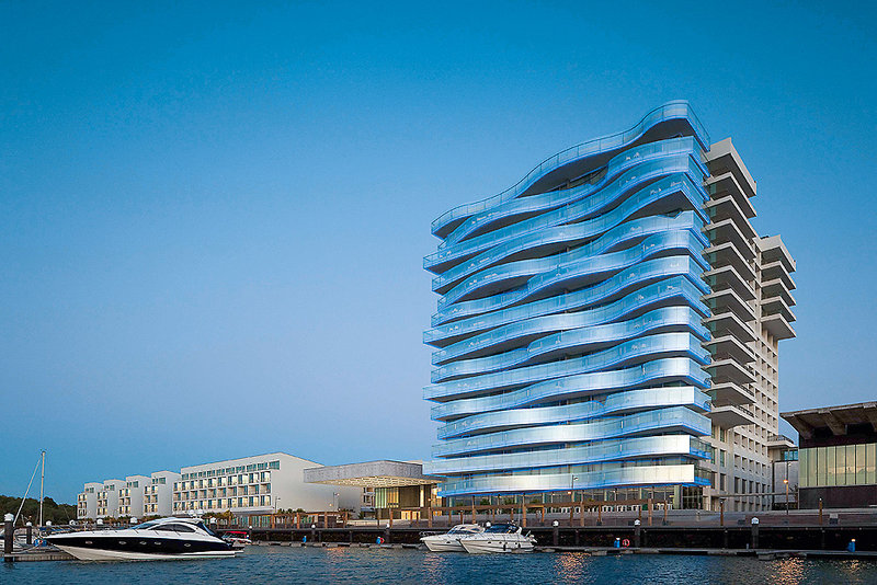 Schon von Weitem sticht die ungewöhnliche Fassade des 14-stöckigen Hauses ins Auge, dessen geschwungene Balkone am Abend in eindrucksvoller Beleuchtung erstrahlen. Glas, Beton und Chrom, kombiniert mit Holz und Lack, bestimmen das moderne, designorientierte Ambiente mit klarer Linienführung und offen gestalteten Räumlichkeiten.