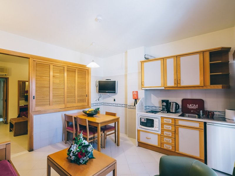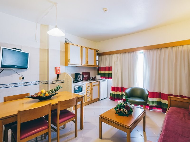 Essen & Trinken: Die gastronomischen Einrichtungen umfassen ein Restaurant, einen Frühstückssaal und eine Bar. Das Apartmenthotel bietet als buchbare Verpflegungsleistungen Halbpension, Vollpension und All-Inclusive. Als Mahlzeiten können Frühstück, Mittagessen und Abendessen gewählt werden. Diätgerichte, glutenfreie Mahlzeiten, vegetarische Gerichte und Kindermenüs werden auf Wunsch zubereitet. Zusätzlich sind spezielle Verpflegungsangebote und Snacks erhältlich. Das Hotel führt ein Sortiment alkoholischer und alkoholfreier Getränke.