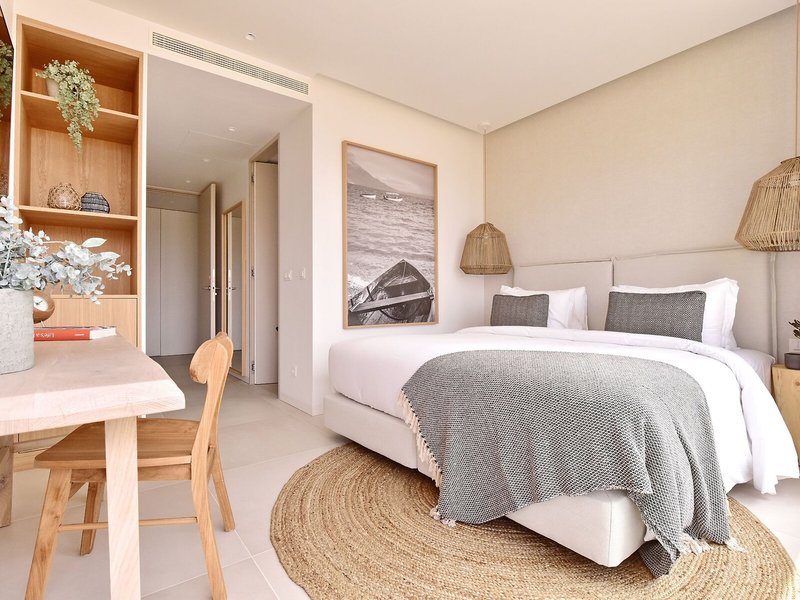 - One Bedroom Apartment (APX1), Appartement, Nichtraucherzimmer, Neubau, Gartenseite, Gartenblick, Landblick, ca. 80 - 85 m², letzte Komplettrenovierung 2023, Gesamtanzahl der Räume in diesem Zimmertyp: 2, Aufteilung wie folgt: Wohnzimmer, 1 Schlafzimmer, 1 Doppelbett, 1 King Size Bett (160x200cm), Klimaanlage: ohne Gebühr, individuell regelbar, zentral gesteuert, Heizung: individuell regelbar, zentral gesteuert, Fußboden: Laminat, Safe: ohne Gebühr, Sofa, Küche, Kühlschrank: ohne Gebühr, Backofen, Mikrowelle, Geschirrspüler, Nespressomaschine, Kaffee-/Teezubereiter, Wasserkocher, Toaster, Esstisch, Telefon, Internet: WLAN/WiFi: ohne Gebühr, Fernseher: im Wohnbereich, Pay-TV, Kabel-TV, Roomservice: täglich, gegen Gebühr, Reinigungsservice: täglich, ohne Gebühr, Dusche, separates WC, 2 Bäder, Balkon: mit Liegestühlen