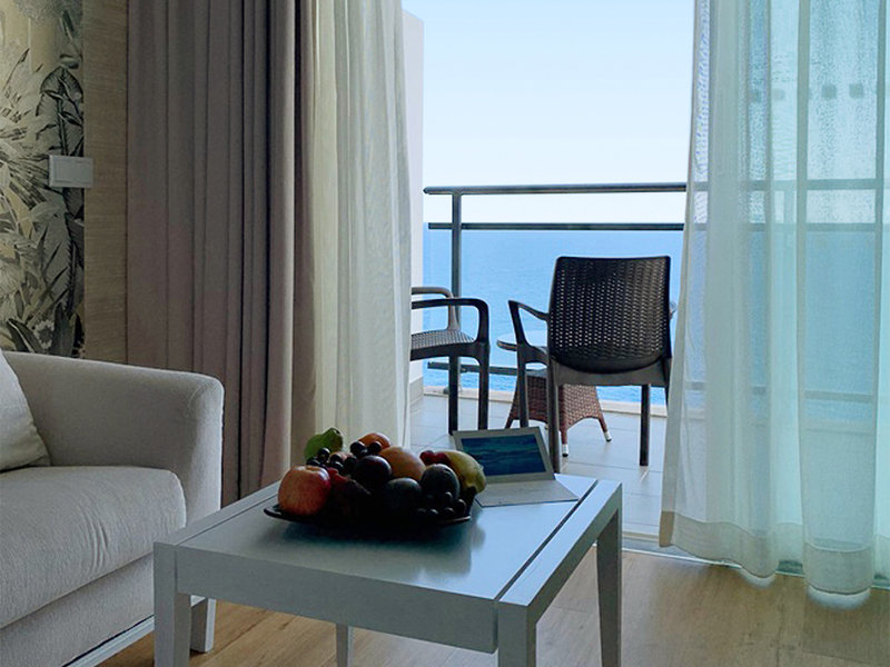 Premier-Juniorsuiten (JSP, ca. 39 qm), im Adults-only Bereich (ab 16 Jahren), hochwertige Ausstattung, Klimaanlage, Minikühlschrank, TV, Telefon, WLAN, Safe. Bad (ab 01.11.25 Dusche), WC, Föhn. Balkon, Meerblick. Max. 2E. Kostenloser Eintritt ins Thalasso-Spa.