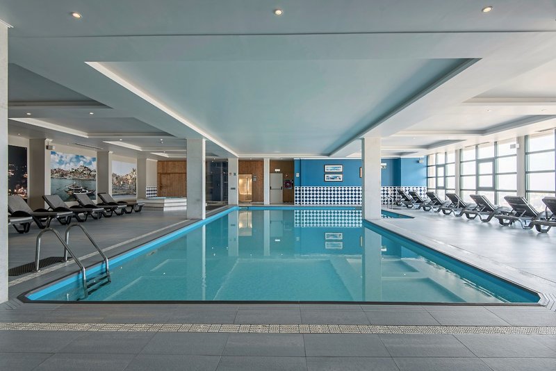 Fitnessbereich und Indoorpool im 18. Stock mit Panoramablick über die Stadt