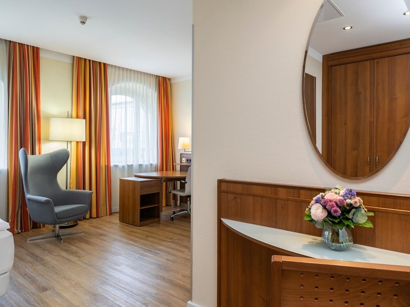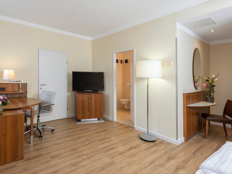 - Superior-Zimmer (DZX2), Doppelzimmer, Nichtraucherzimmer, Gartenseite, Straßenseite, Gartenblick, Stadtblick, ca. 23 - 32 m², Gesamtanzahl der Räume in diesem Zimmertyp: 1, Aufteilung wie folgt: kombiniertes Wohn-/Schlafzimmer, 1 Doppelbett (160x200cm), Babybett: ohne Gebühr, Anfrage & Reservierung notwendig, Klimaanlage: individuell regelbar, Heizung: individuell regelbar, Fußboden: Laminat, Teppichboden, Safe: ohne Gebühr, Schreibtisch, Minibar: gegen Gebühr, Softdrinks: gegen Gebühr, Wasser: gegen Gebühr, Snacks: gegen Gebühr, Minibarauffüllung: 11:00 Uhr - 13:00 Uhr, Telefon, Internet: WLAN/WiFi: ohne Gebühr, Fernseher: Flatscreen, im Schlafzimmer, Roomservice: 07:00 Uhr - 11:00 Uhr, gegen Gebühr, Badewanne oder Dusche, WC, Bademantel: ohne Gebühr, Slipper: ohne Gebühr, Föhn, Kosmetikspiegel