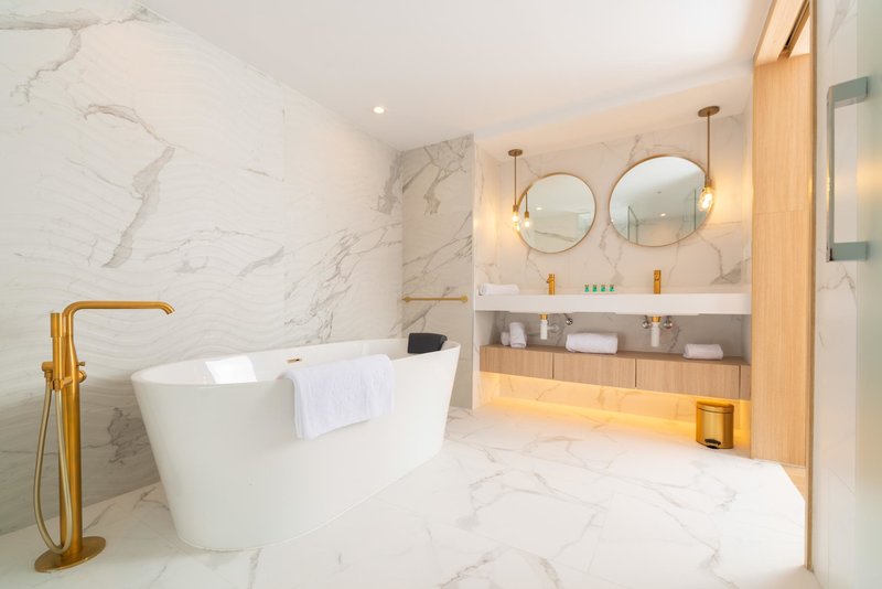 Genießen Sie wohltuende Wasserfalldüsen und eine ruhige Umgebung am Pool, bevor Sie sich ein exquisites Abendessen schmecken lassen.