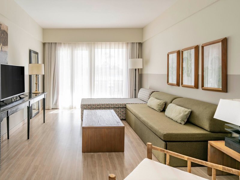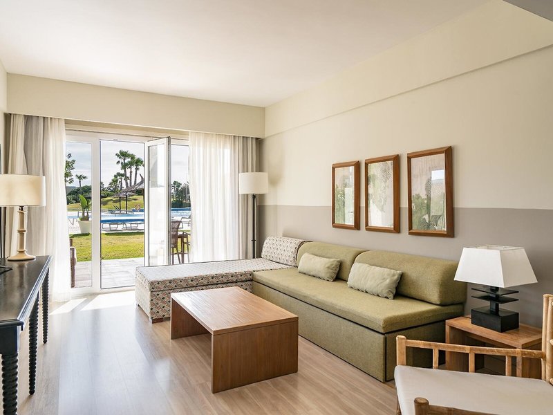 - Suite Typ1 (SUX1), Juniorsuite, Nichtraucherzimmer, im Nebengebäude, Gartenseite, Poolblick, Gartenblick, ca. 45 m², letzte Komplettrenovierung 2008, Gesamtanzahl der Räume in diesem Zimmertyp: 2, Aufteilung wie folgt: kombiniertes Wohn-/Schlafzimmer, 1 Schlafzimmer, 2 Einzelbetten (90x200cm), 1 Schlafsofa (150x200cm), Babybett: ohne Gebühr, Anfrage & Reservierung notwendig, Klimaanlage: ohne Gebühr, saisonabhängig; wetterabhängig, zentral gesteuert, kalt, warm, Safe: ohne Gebühr, Sitzecke, Sofa, Schreibtisch, Minibar: gegen Gebühr, Minibarauffüllung: täglich, Telefon, Internet: WLAN/WiFi: ohne Gebühr, Breitband-Internet/DSL: gegen Gebühr, Fernseher: Flatscreen, im Wohnbereich, im Schlafzimmer, deutsches Programm, Pay-TV, Sat-TV, Reinigungsservice: täglich, ohne Gebühr, Dusche, separate Dusche, Badewanne, WC, Bademantel: ohne Gebühr, Slipper: ohne Gebühr, Föhn, Kosmetikspiegel, Balkon oder Terrasse: mit Sitzgelegenheit