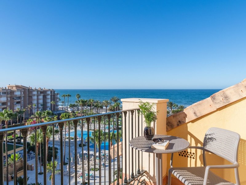 - Suite Senior (SUX1), Suite, im Hauptgebäude, Meerseite, Meerblick, Poolblick, ca. 45 m², letzte Teilrenovierung 2017, Gesamtanzahl der Räume in diesem Zimmertyp: 2, Aufteilung wie folgt: kombiniertes Wohn-/Schlafzimmer, 1 Schlafzimmer, 2 Einzelbetten, 1 Schlafsofa, Babybett: ohne Gebühr, Anfrage & Reservierung notwendig, Klimaanlage: zentral gesteuert, Heizung: zentral gesteuert, Fußboden: Fliesenboden, Safe: gegen Gebühr, Sofa, Schreibtisch, Minibar: gegen Gebühr, Telefon, Internet: WLAN/WiFi: ohne Gebühr, Fernseher: Flatscreen, Sat-TV, Reinigungsservice: täglich, Badewanne oder Dusche, WC, Föhn, Balkon oder Terrasse: mit Liegestühlen, Terrasse: mit Sitzgelegenheit