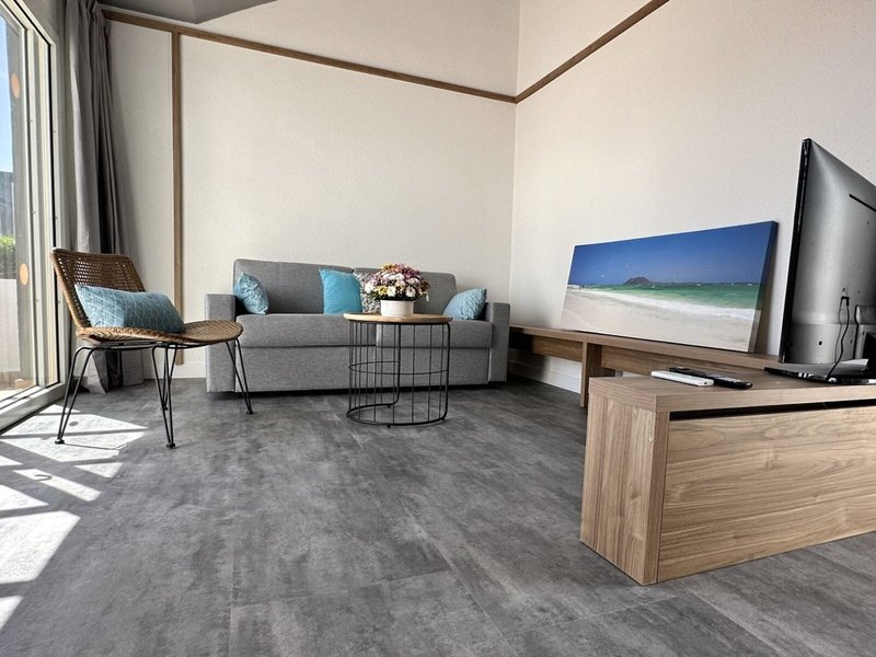 - 1 Bedroom Bungalow (BUX1), Doppelzimmer, ca. 25 m², letzte Komplettrenovierung 2023, Gesamtanzahl der Räume in diesem Zimmertyp: 2, Aufteilung wie folgt: Wohnzimmer, 1 Schlafzimmer, 2 Einzelbetten (90x200cm), 1 Schlafsofa (140x200cm), Klimaanlage: ohne Gebühr, Fußboden: Laminat, Safe: gegen Gebühr, Sofa, Schreibtisch, Minibar: gegen Gebühr, Internet: WLAN/WiFi: ohne Gebühr, Fernseher: im Wohnbereich, Badewanne oder Dusche, WC, Balkon oder Terrasse: mit Sitzgelegenheit