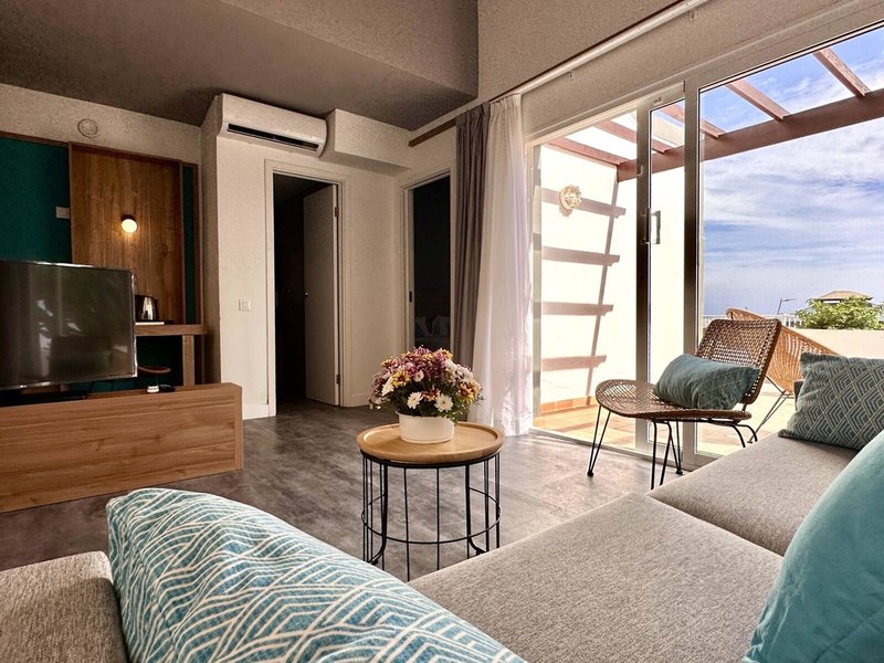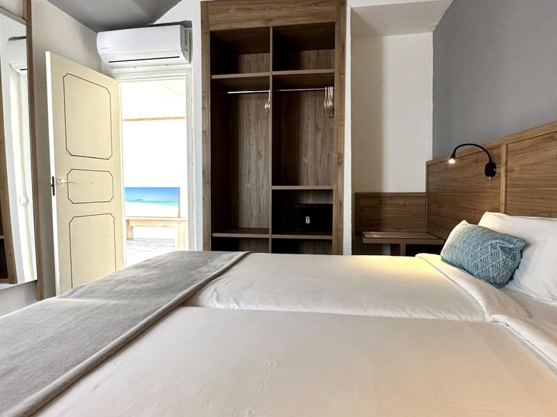 - 1 Bedroom Bungalow Sea view (BUM1), Bungalow, Meerseite, Meerblick, ca. 25 m², letzte Komplettrenovierung 2023, Gesamtanzahl der Räume in diesem Zimmertyp: 2, Aufteilung wie folgt: Wohnzimmer, 1 Schlafzimmer, 2 Einzelbetten (90x200cm), 1 Schlafsofa (140x200cm), Klimaanlage: individuell regelbar, Fußboden: Laminat, Safe: gegen Gebühr, Minibar: gegen Gebühr, Internet: WLAN/WiFi, Fernseher: Flatscreen, im Wohnbereich, Dusche, WC, Balkon oder Terrasse: mit Sitzgelegenheit, Terrasse: mit Sitzgelegenheit