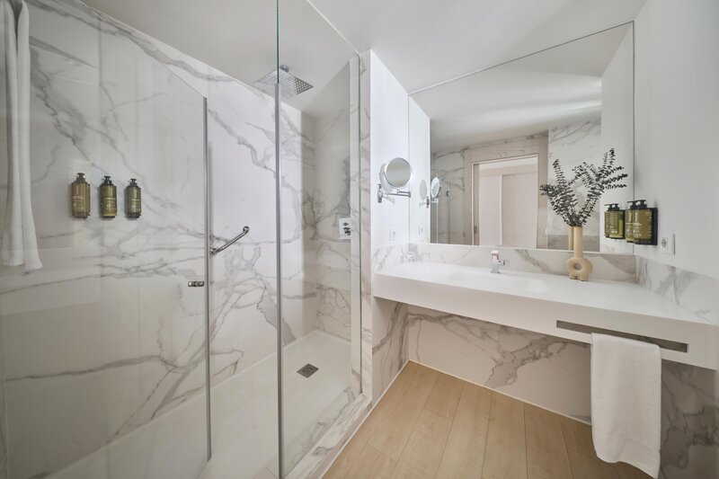 Wohnen: Doppelzimmer (DZ, ca. 32 qm), Klimaanlage, Minibar (gegen Gebühr), Safe, TV, WLAN. Dusche/ WC, Föhn, Bademäntel, Slipper. Balkon/Terrasse. Max. 3E, wahlweise mit seitlichem,- (DSM), Meerblick (DZM, max. 3E) oder als Doppelzimmer mit Sharing-Pool und Liegen auf der Terrasse (DZP, max. 2E), zur Alleinnutzung buchbar. (EZ,ESM,EZM)