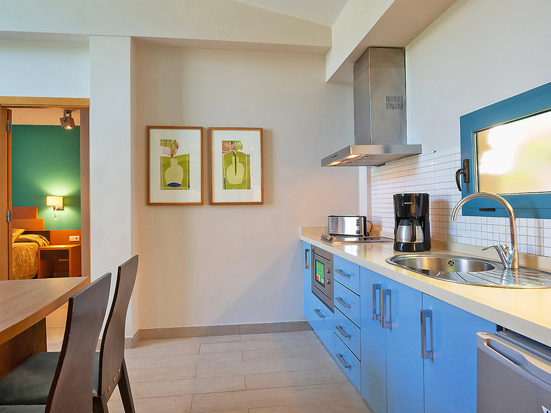 Wohnen: Appartement Typ B (APB, ca. 60 qm), Wohnraum, Deckenventilator, separates Schlafzimmer, Küchenzeile, TV, WLAN, Mietsafe. Dusche, WC, Föhn. Balkon oder Terrasse mit u. a. Sonnenliegen und Außendusche. Max. 3E/2E+2K, zur Alleinnutzung buchbar. (APE)