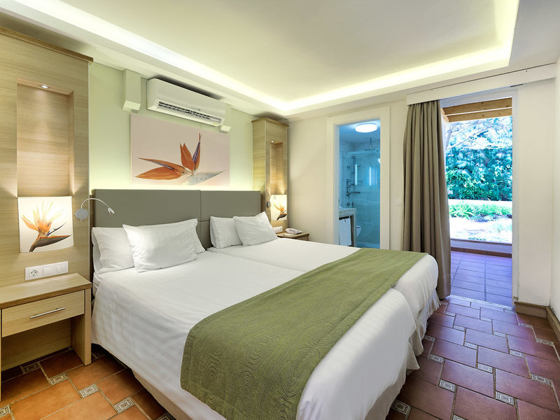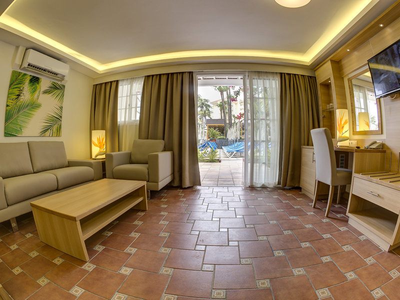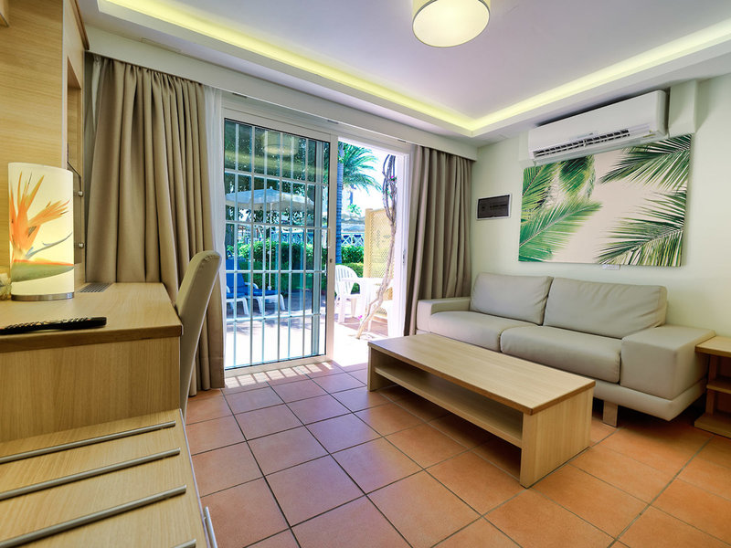 - Suite with pool view (Bungalow PV GV) (BUX1), Bungalow, Poolseite, Poolblick, Gartenblick, ca. 40 - 45 m², letzte Komplettrenovierung 2015, Gesamtanzahl der Räume in diesem Zimmertyp: 1, Aufteilung wie folgt: kombiniertes Wohn-/Schlafzimmer, 2 Einzelbetten, 1 Zustellbett, Klimaanlage: ohne Gebühr, saisonabhängig, zentral gesteuert, kalt, Fußboden: Fliesenboden, Safe: gegen Gebühr, Minibar: gegen Gebühr, Wasser: ohne Gebühr, Telefon, Internet: WLAN/WiFi: ohne Gebühr, Fernseher: Flatscreen, im Schlafzimmer, deutsches Programm, Sat-TV, Badewanne oder Dusche, WC, Bademantel: gegen Gebühr, Föhn, Terrasse: mit Sitzgelegenheit