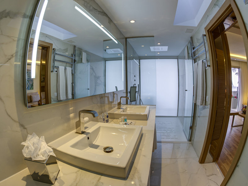- Suita s výhľadom na more (Bungalov SV) (BUM1), bungalov, prvý rad na pláž, morská strana, výhľad na more, cca 60 - 65 m², posledná kompletná rekonštrukcia v roku 2015, celkový počet izieb v tomto type izby: 1, rozloženie takto : kombinovaná obývačka/spálňa, 2 jednolôžka, 1 prístelka, klimatizácia: zadarmo, sezónna, centrálne riadená, studená, podlaha: parkety, trezor: zadarmo, pohovka, minibar: za poplatok, voda: zadarmo poplatok, telefón, Internet: WLAN/WiFi: zadarmo, TV : plochá obrazovka, v obývacej časti, nemecké kanály, satelitná TV, sprcha, WC, župan: za poplatok, platba v hotovosti, fén, kozmetické zrkadlo, terasa : s ležadlami, s posedením, s vírivkou