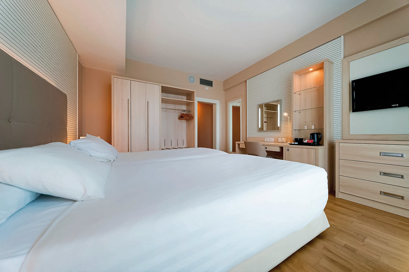 - 26-30 m2, dvojlôžková izba, výhľad na more, písací stôl, sprcha alebo vaňa, WC, fén, kozmetické zrkadlo, parkety, klimatizácia, minibar za poplatok, trezor (za poplatok), TV (satelitná TV), balkón ( zariadený)