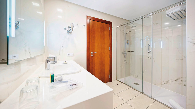 - 41-45 qm, Suite, Meerblick, kombinierter Wohn-/Schlafraum, Schreibtisch, Dusche oder Badewanne, WC, Haartrockner, Kosmetikspiegel, Parkett, Klimaanlage, Minibar kostenpflichtig, Safe (kostenpflichtig), TV (Sat-TV), Balkon (möbliert)