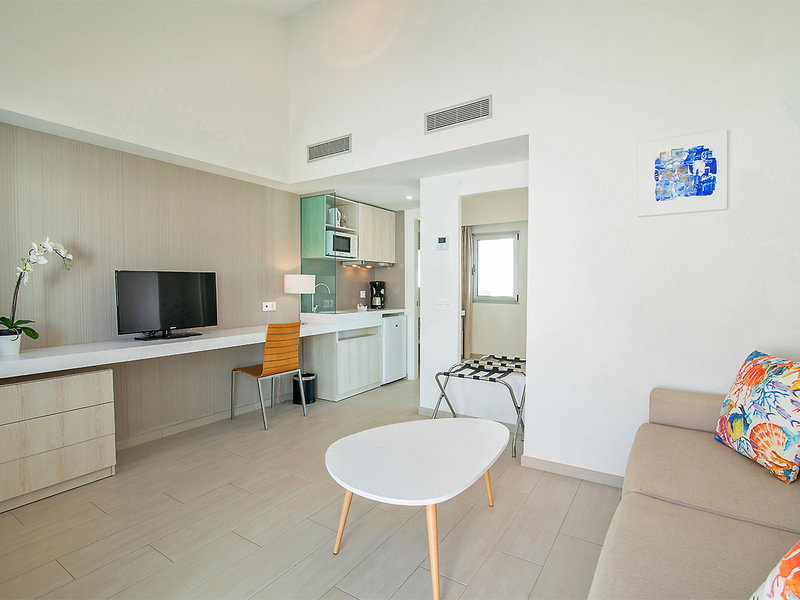 Suite Rooftop (SUF, adults only ab 16 J.), Wohnraum (Schlafmöglichkeit für 3./4. Pers.), sep. Schlafzimmer, Kitchenette, Telefon, TV, WLAN, Mietsafe. Bad mit Dusche, WC. Möblierte Dachterrasse (über eine Wendeltreppe erreichbar). Max. 3E