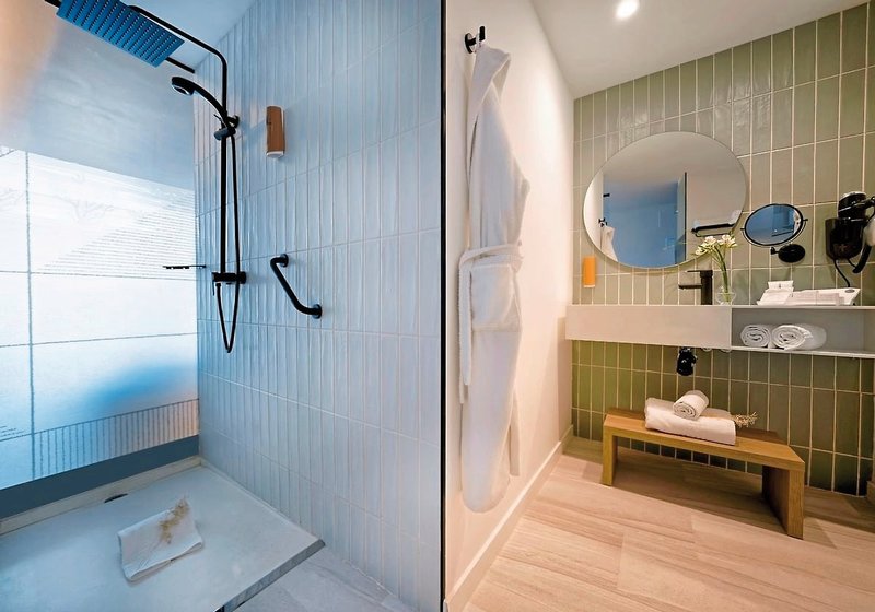 - 36-40 qm, Juniorsuite, Meerblick, optisch getrennter Wohn-/Schlafraum, Ankleidebereich, Schreibtisch, Doppelbetten (1 Doppel- oder 2 Einzelbetten), Sofabett, Regendusche, WC, Haartrockner, Kosmetikspiegel, Klimaanlage, Mini-Kühlschrank, Safe, TV (Sat-TV), Wasserkocher, Espressomaschine, Balkon oder Terrasse (möbliert), bei Ankunft im Zimmer Wasser