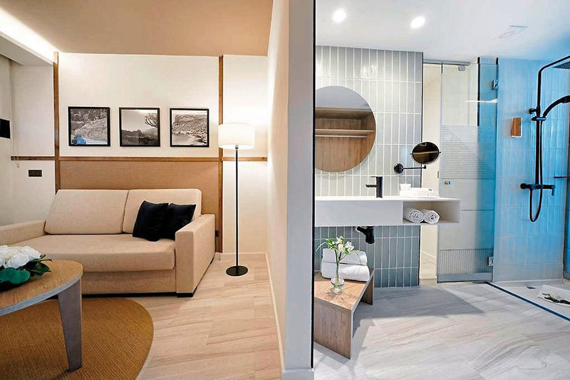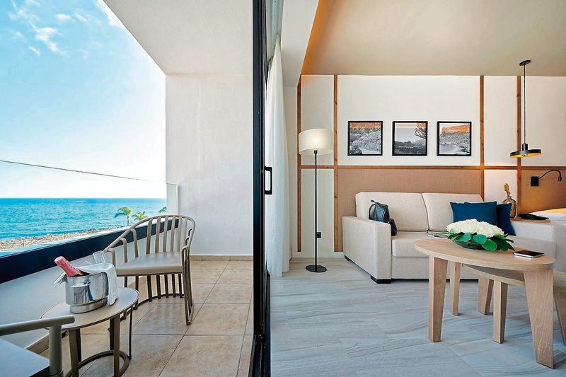 - 36-40 qm, Juniorsuite, Superior, Meerblick, optisch getrennter Wohn-/Schlafraum, Ankleidebereich, Schreibtisch, Doppelbetten (1 Doppel- oder 2 Einzelbetten), Sofabett, Regendusche, WC, Haartrockner, Kosmetikspiegel, Klimaanlage, Mini-Kühlschrank, Safe, TV (Sat-TV), Espressomaschine, Balkon oder Terrasse (möbliert), bei Ankunft im Zimmer Wasser