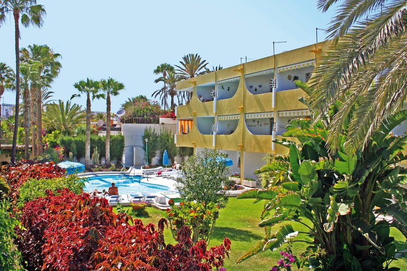 Er liegt im bevorzugten Appartement- und Villenviertel von Playa del Inglés in zweiter Strandreihe ruhig in einer Nebenstraße.